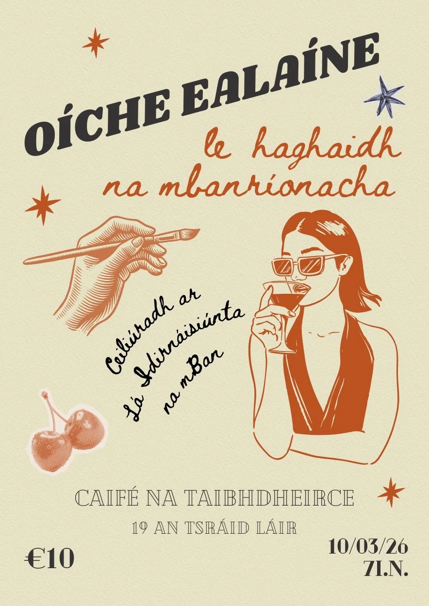 OÍCHE EALAÍNE 10 MÁRTA 2026 €10 TUILLEADH EOLAIS OÍCHE SCRÍOB 12 MÁRTA 20267 I.N. TUILLEADH EOLAIS An Chéad Ghlúin Eile17ú Márta 2026 8 i.n. TICÉID/TICKETS Éisteachtaí Oscailte An Taibhdhearc / ZOOM 11Ú Márta 2026 -12ú Márta 2026 Tuilleadh Eolais Puipéadóireacht 5ú MártaSaor in aisce TICÉID/TICKETS