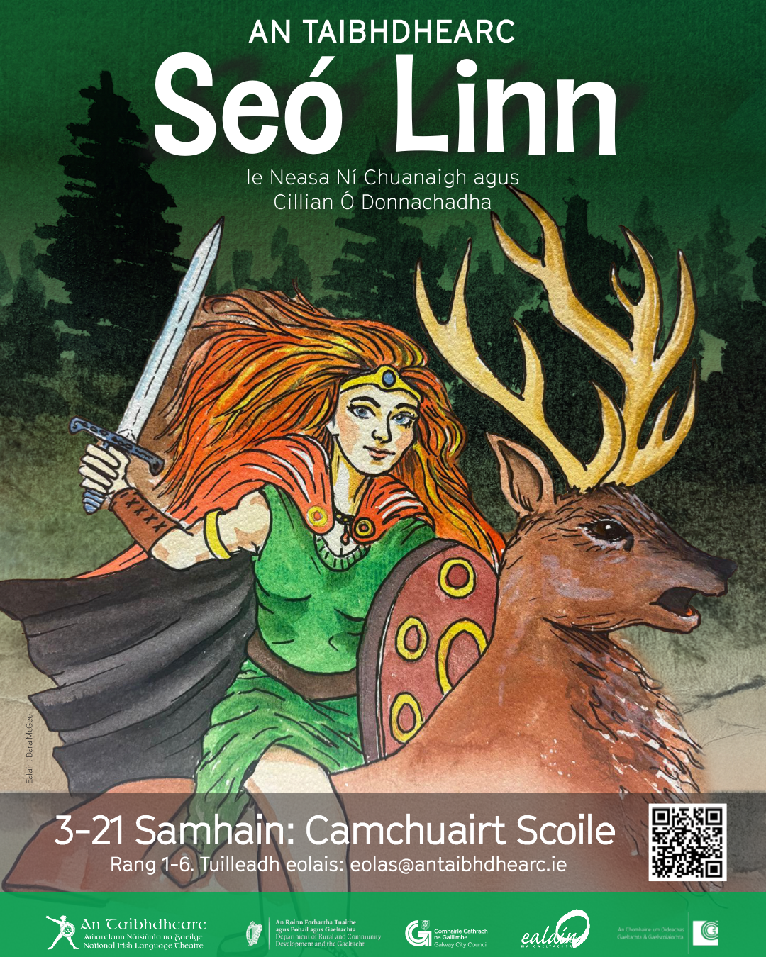 This project deepens An Taibhdhearc’s connection with local communities and celebrates creativity through the Irish language, made possible by the continued support of the Department of Rural and Community Development and the Gaeltacht. The artists are additionally supported by Ealaín na Gaeltachta under their ‘Cuisle’ project to develop youth arts, and An Chomhairle Oideachas Gaeltachta & Gaelscolaíochta